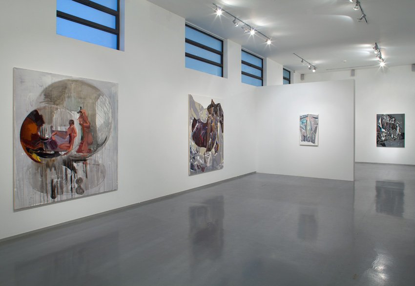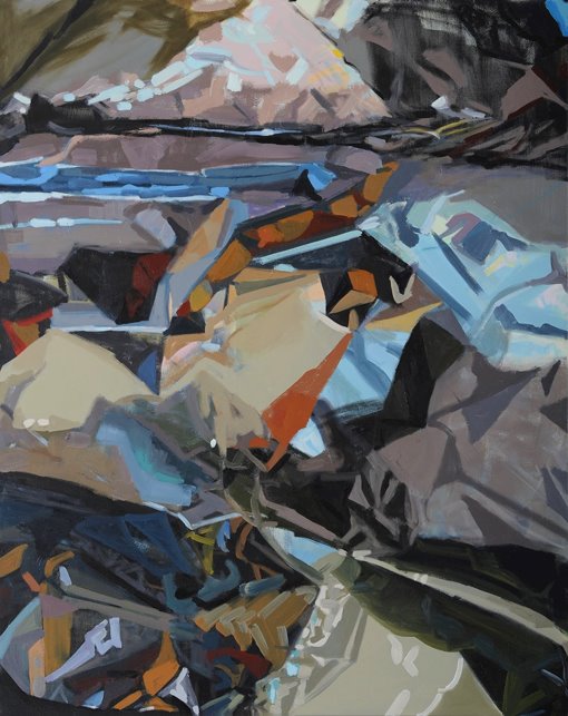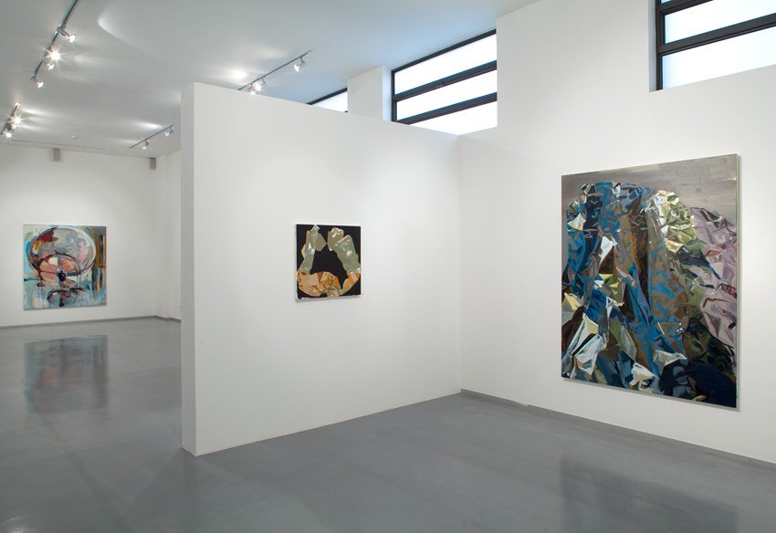 In one series a mountainous landscape of rocks and cliffs, canyons and rivers, becomes an artificial otherworldly environment. Klein, like a director or a wizard, has conjured these images from still lifes she arranges from everyday banal materials: sheets of aluminum foil, crumpled up and folded. The large scale of the work and Klein’s unique way of painting intensify the small scenes on the table until they assume a monumental scale. This way of painting consists of, on the one hand, matter-of-fact observing–distant, cold, and analytical–and, on the other, an expressive and manipulated look. Reflections of light, objects, and color abound, as well as the dull metallic grayness of the aluminum foil: all of which is transformed into stains and lines, rhythmic shapes of colorful patchworks in brushstrokes that build and dismantle.