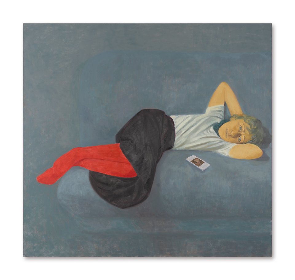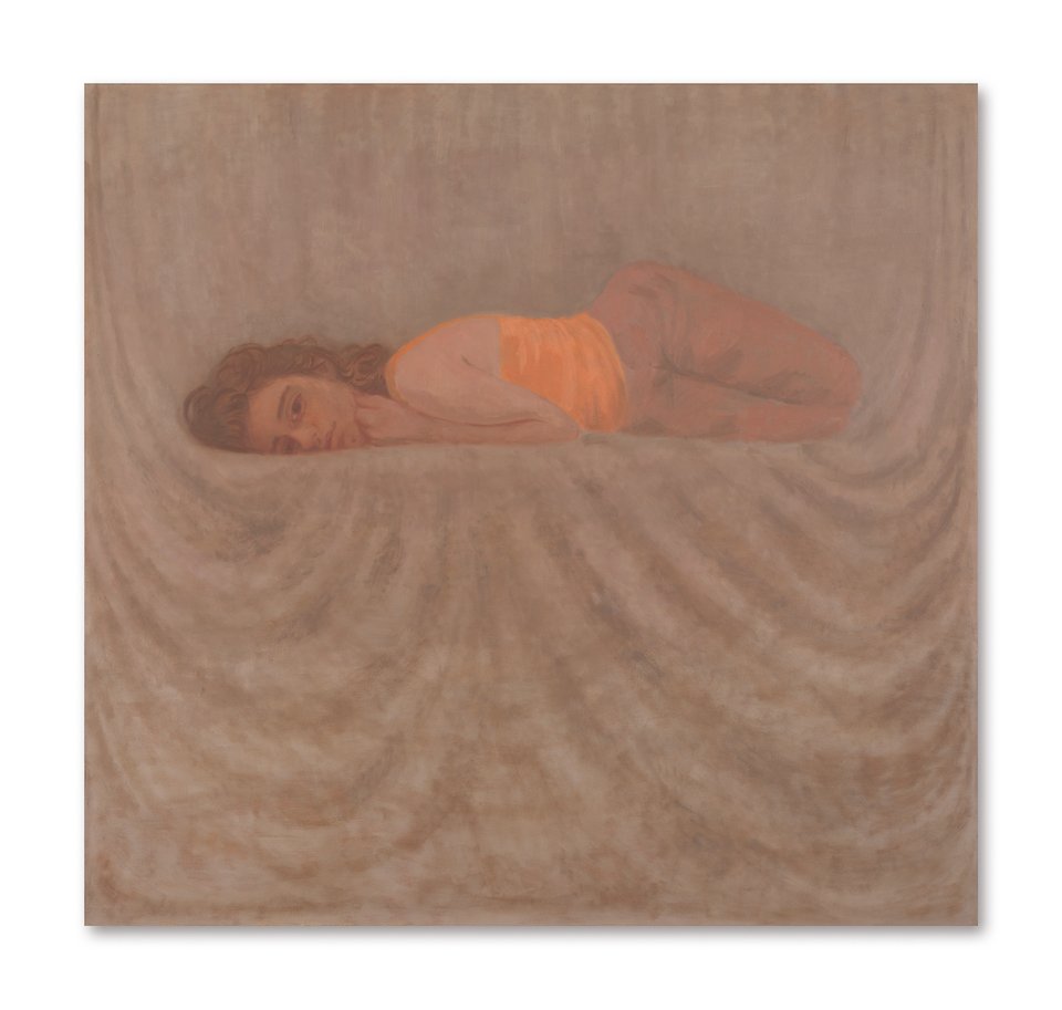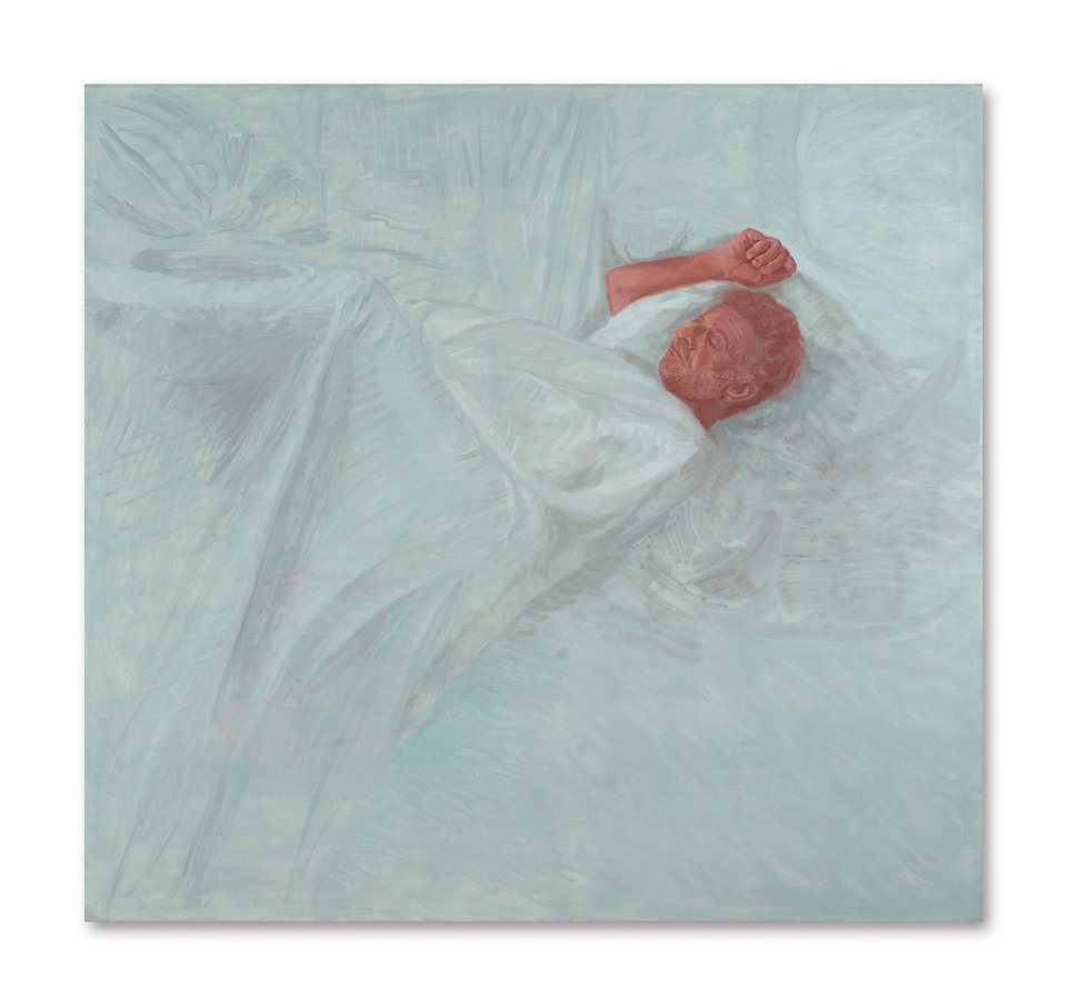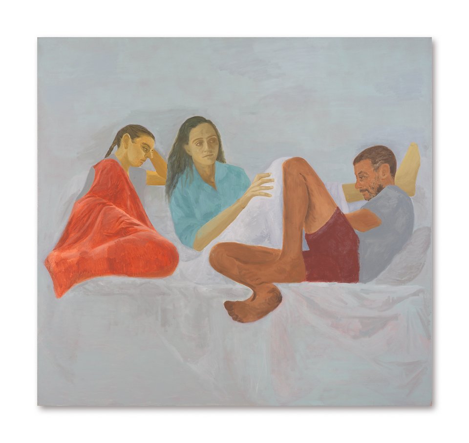 The paintings in the series Night Train are windows into a sequence of intimate scenes, portraying friends or family members. The figures lie or sit on beds or sofas, alone or in a group, amid bedding and fabrics, fully or partially clothed. The bed—setting for many of life’s situations: sleep and rest, sex, birth, and death—becomes a realm of existence both physical and dreamlike, evoking the unconscious and inviting reflection on the everyday and the banal.