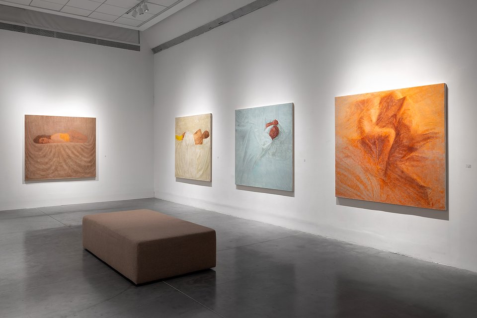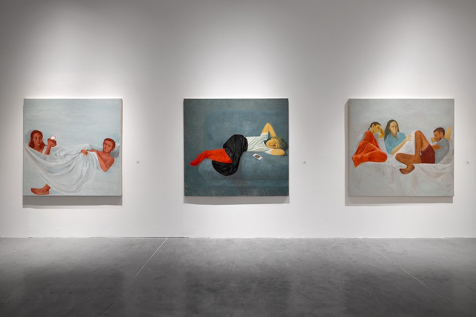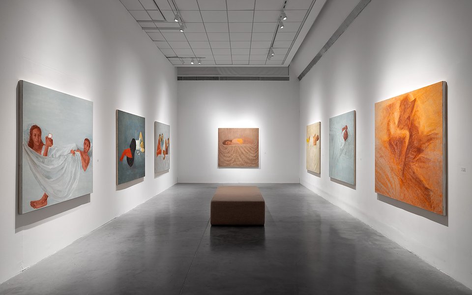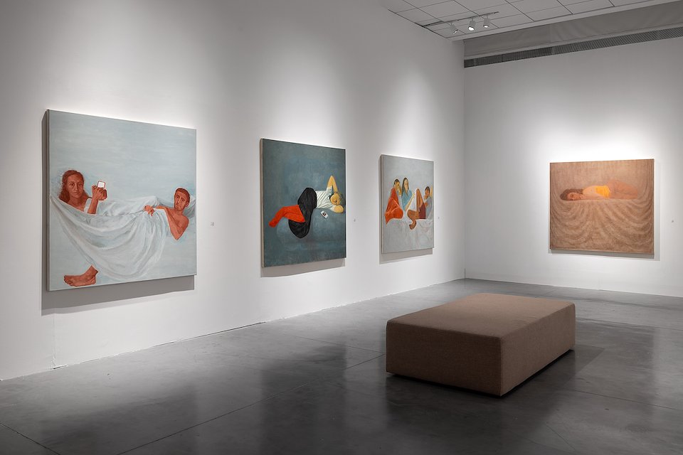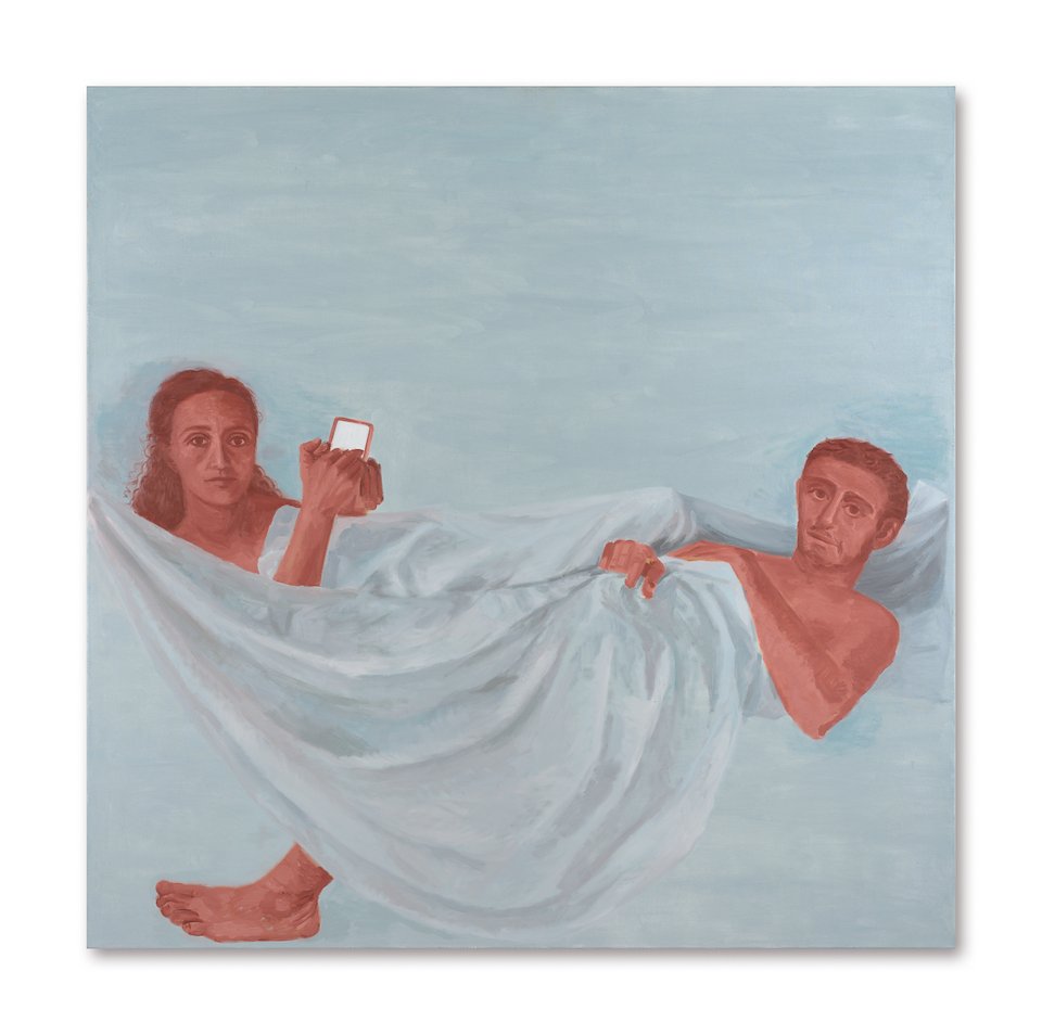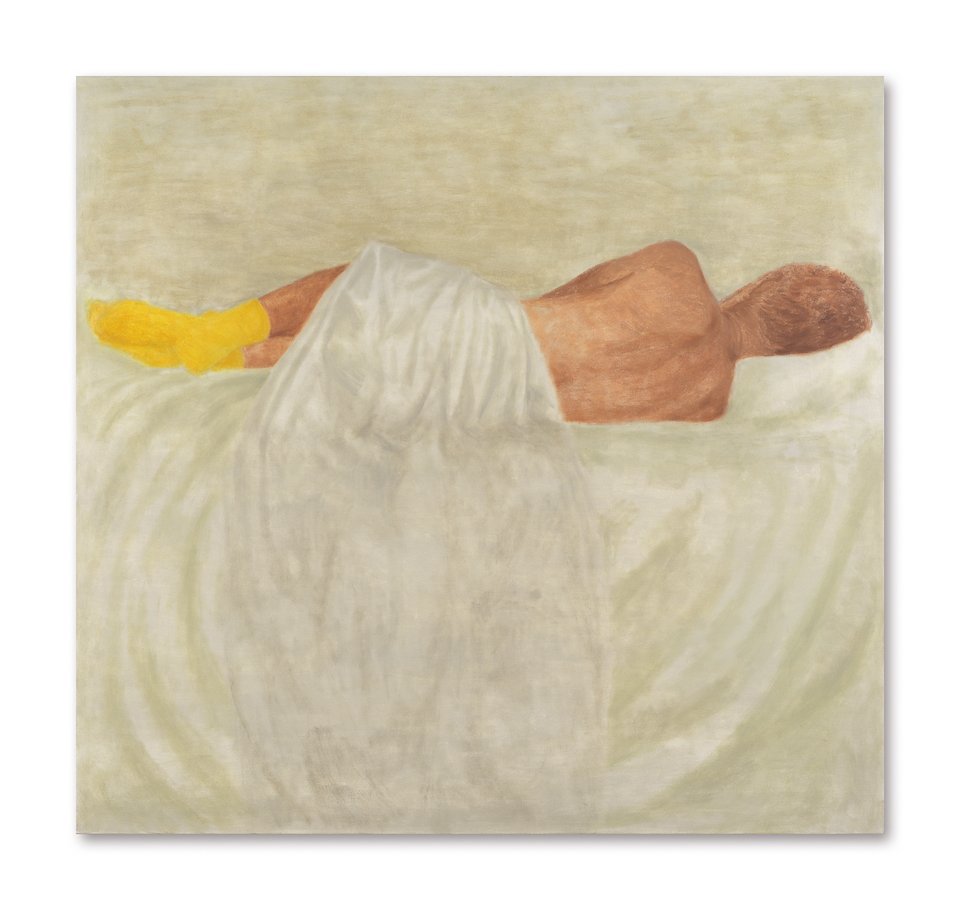 The paintings in the series Night Train are windows into a sequence of intimate scenes, portraying friends or family members. The figures lie or sit on beds or sofas, alone or in a group, amid bedding and fabrics, fully or partially clothed. The bed—setting for many of life’s situations: sleep and rest, sex, birth, and death—becomes a realm of existence both physical and dreamlike, evoking the unconscious and inviting reflection on the everyday and the banal.